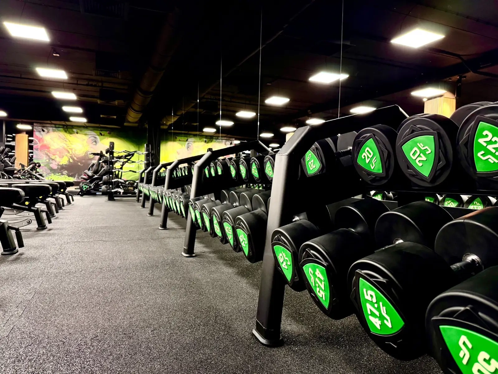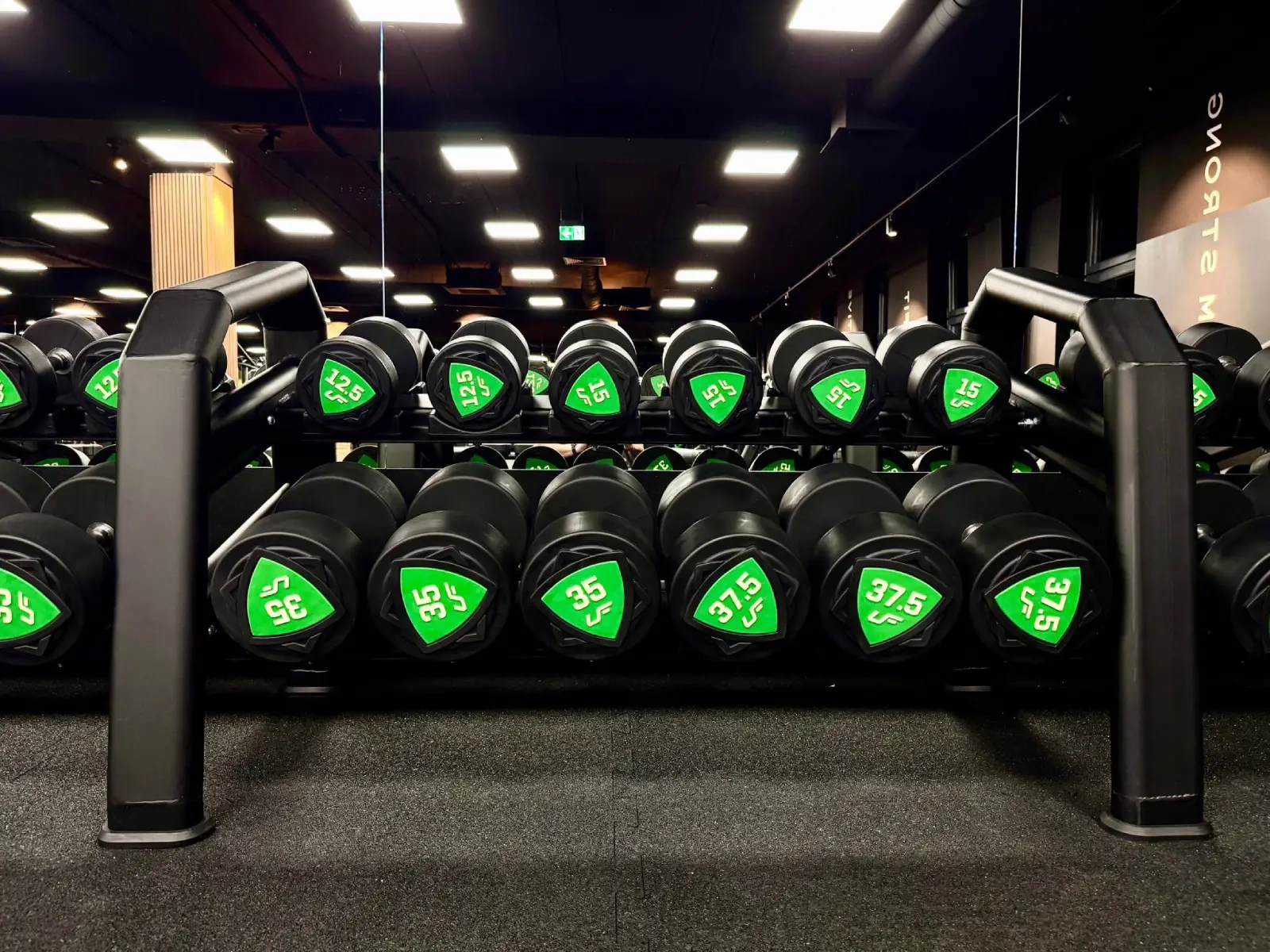 Hay 5 apoyos para mancuernas en cada uno de los dos soportes para mancuernas. Pueden colocarse mancuernas con una dimensión interna del mango de 120 mm y un diámetro máximo de 210 mm. La construcción del soporte para mancuernas es de chapa metálica de 4 mm de grosor.
